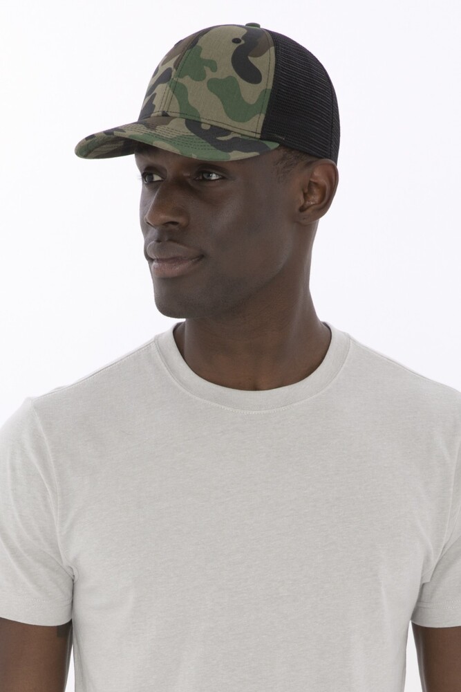 Front panels: 100% cotton twill. Mid and back panels: 100% polyester mesh. 6-panel. Adjustable snapback closure. Mid profile. Structured.